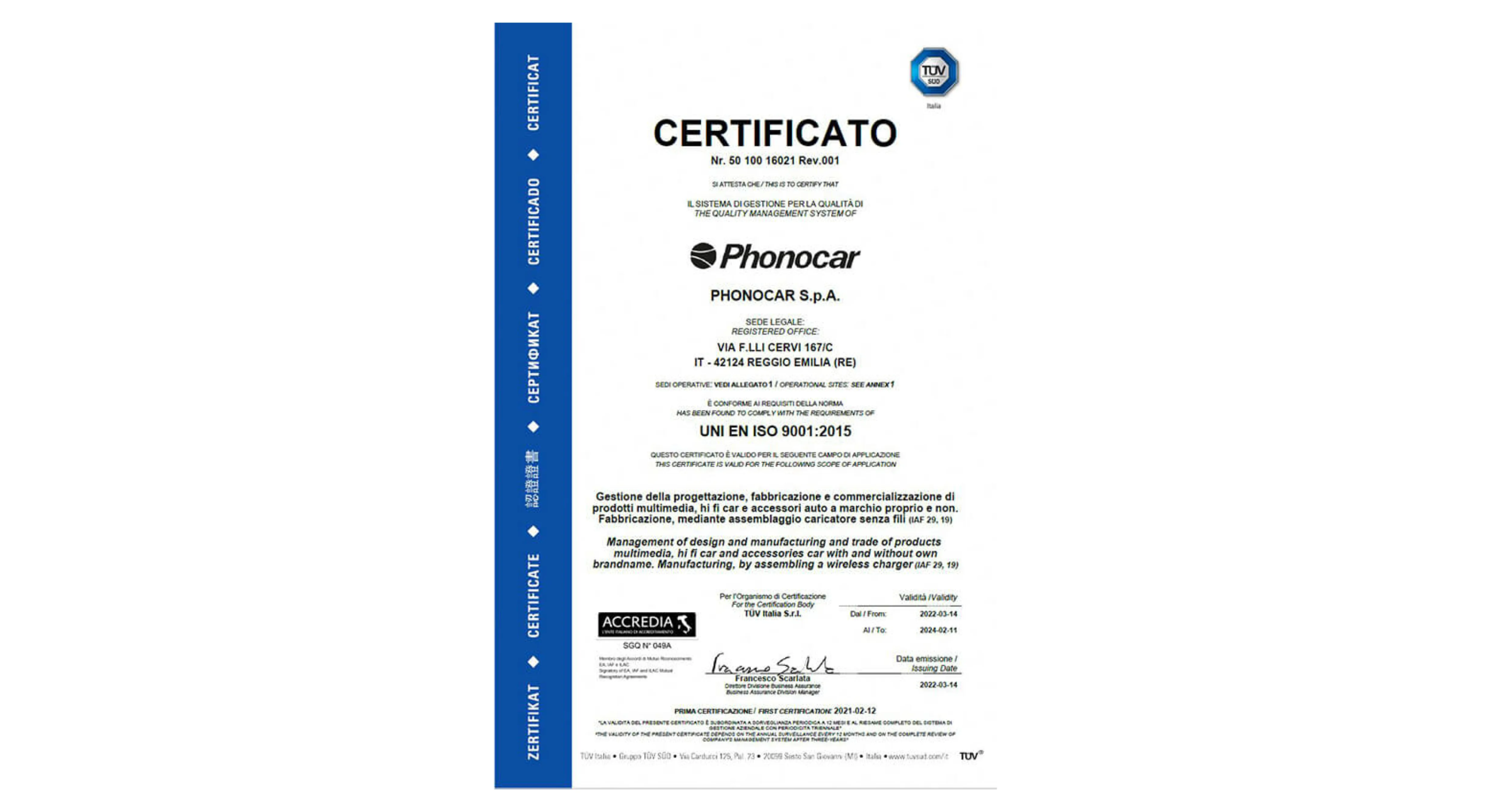 L’azienda ha ottenuto la Certificazione UNI EN ISO 9001:2015 per la progettazione, fabbricazione e commercializzazione di prodotti multimedia, hi-fi car e accessori auto.